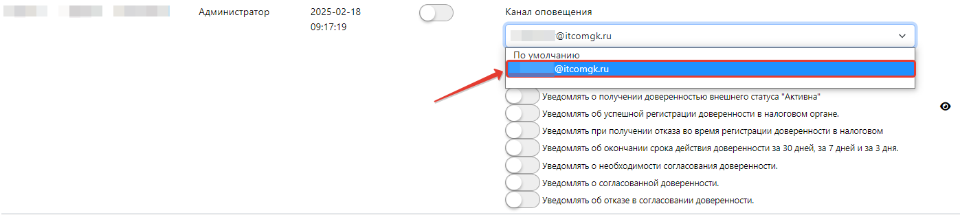 На вкладке «Пользователи» выберите из выпадающего списка тот email, на который хотите получать уведомления от данной организации.