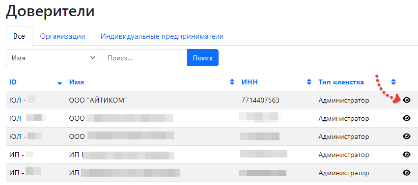 Вернитесь в раздел «Доверители» вы увидите список всех ваших организаций. Напротив нужной нажмите на пиктограмму «глаз» для редактирования электронной почты.
